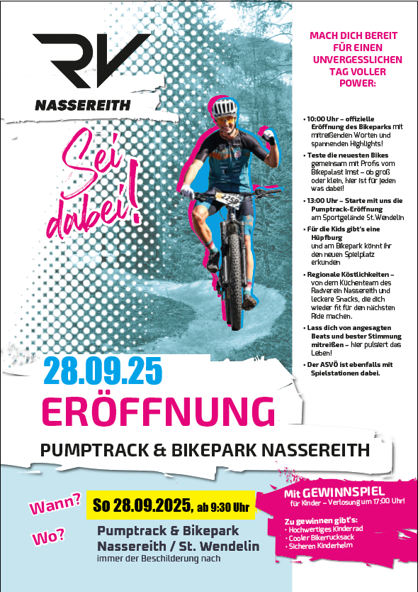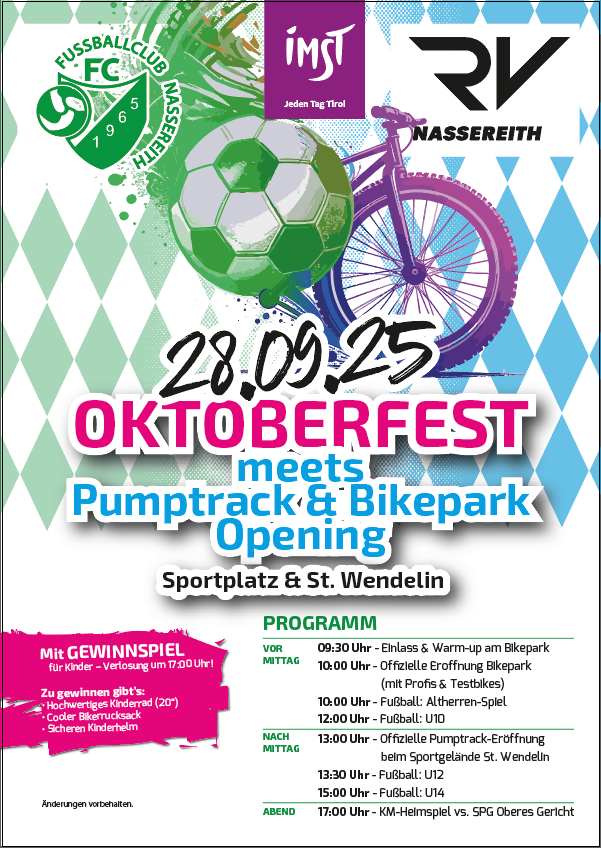 Am Sonntag, den 28. September 2025, verwandelt sich Nassereith in einen aktiven- festlichen Treffpunkt für die ganze Region. Der Radverein Nassereith und der FC-Nassereith laden gemeinsam zur großen Mega-Veranstaltung ein: „Oktoberfest meets Pumptrack & Bikepark Opening“.